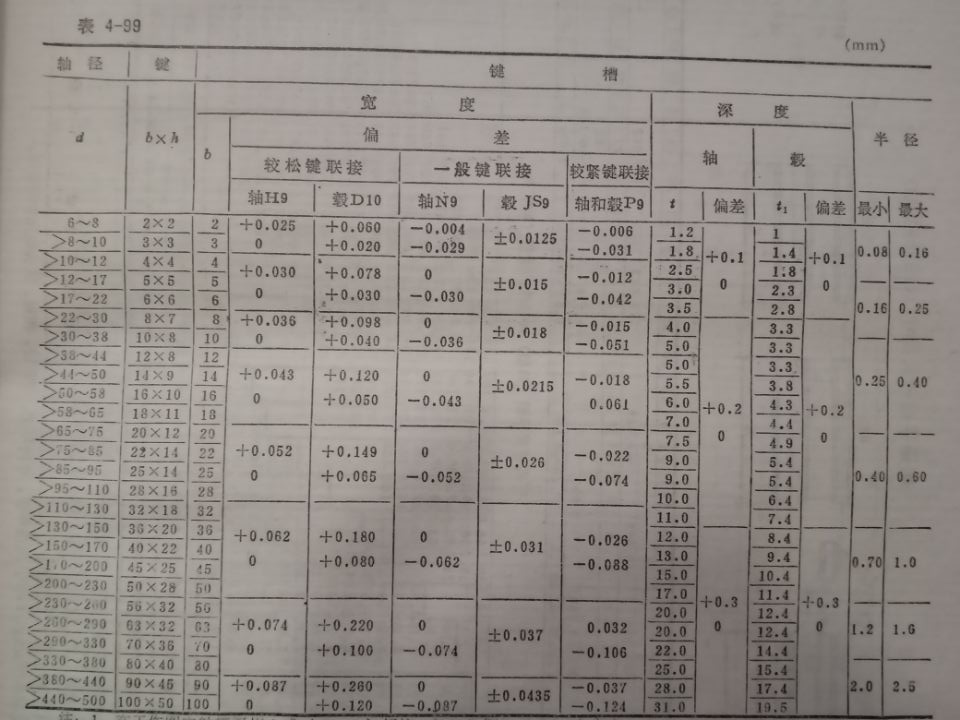 3.除軸仲外,在保證傳遞所需扭矩條件下,允許采用較小刨面的聯軸器鍵。但t和t1的數值必要時應重新計算,使軸槽及輪槽與鍵的接觸高度各位h/2.
